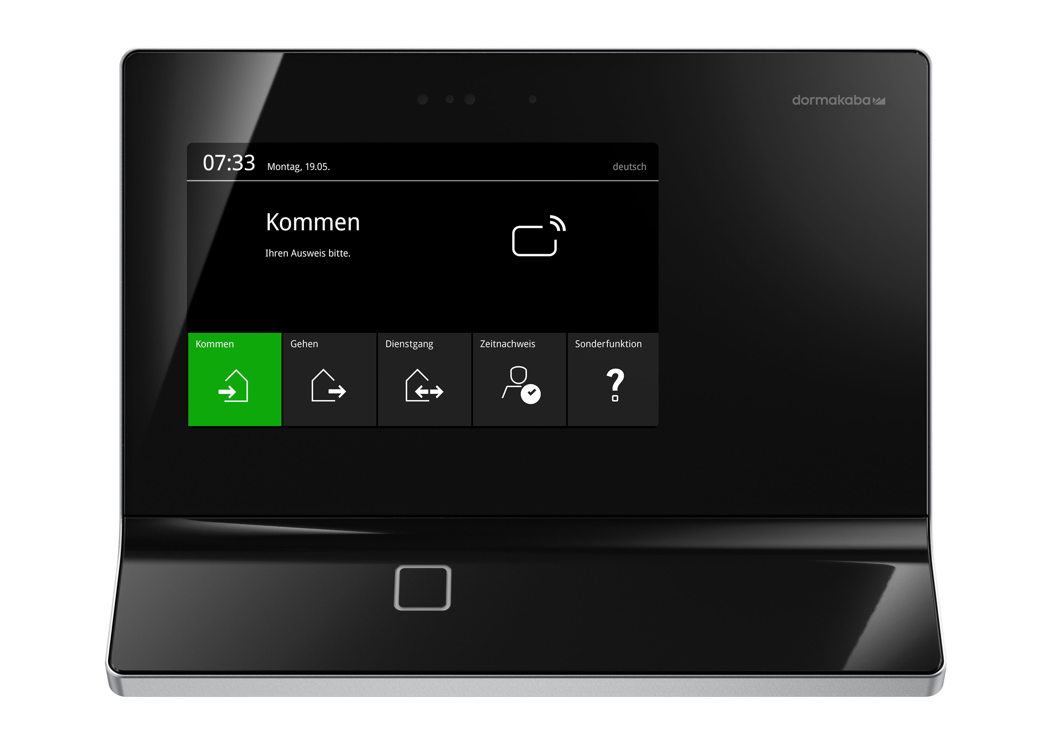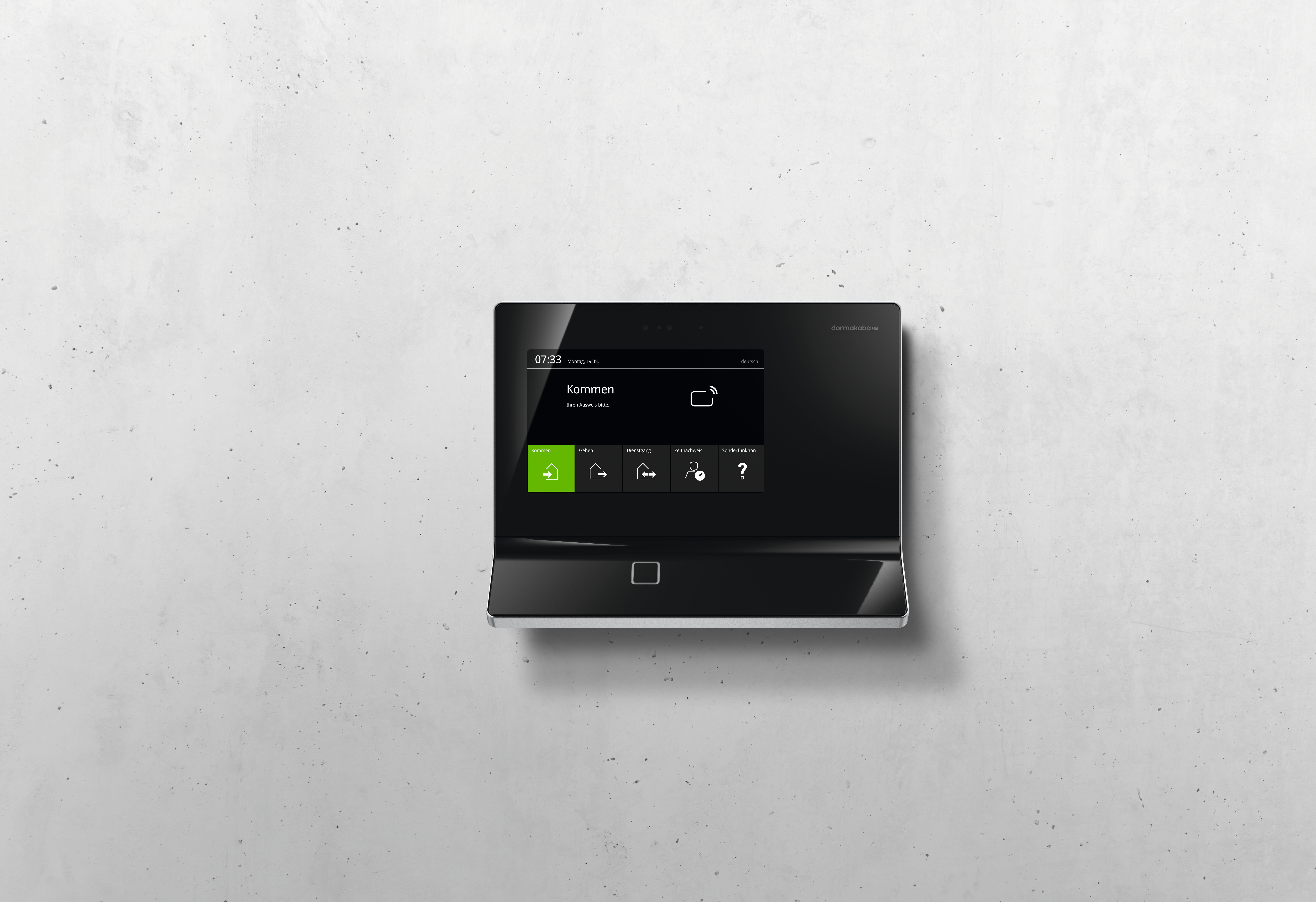 Das dormakaba Terminal 97 00 setzt Maßstäbe in Funktionalität und Design. Und spart dank Näherungssensor auch noch Energie. Das modular erweiterbare Multitalent steht für moderne und einfache Zeiterfassung sowie für intelligentes Zutrittsmanagement und eine zielgerichtete Mitarbeiterkommunikation. Die Benutzeroberfläche ist frei konfigurierbar. Auf Wunsch erscheint das Display im eigenen Firmenlook, mit eigenen Hintergrundbildern, Farben, Signaltönen, Apps und (Multimedia-) Inhalten. Zusatzoptionen wie Biometrieleser oder Kamera runden das flexibel an firmenindividuelle Bedürfnisse anpassbare System ab.
